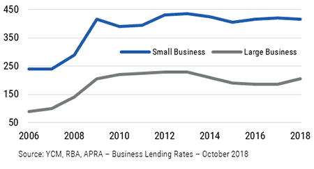 In Australia it’s a much different story: a tightening regulatory environment has seen local banks reduce exposures to riskier assets. Corporate and commercial property exposures peaked at ~40% of total loans in 2007 and have declined to ~34% today, and the Financial Services Royal Commission will – at the very least – maintain a tightening bias to lending standards.