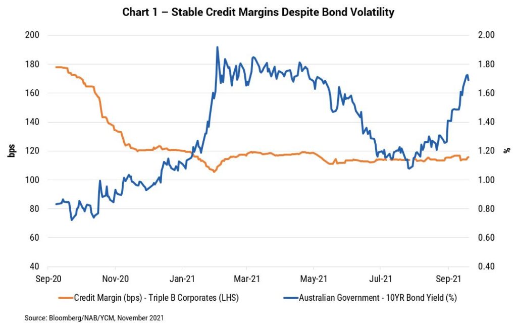 Confidence in our ability to generate strong returns over the next 12 months is premised on several factors. Firstly, despite recent volatility associated with the potential emergence of inflation and very volatile government bond yields, corporate credit margins have pleasingly remained broadly range bound throughout 2021 (refer Chart 1).