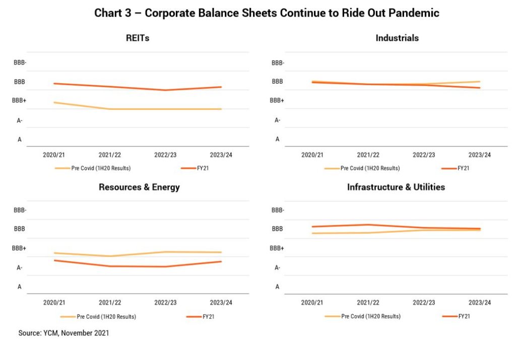 Moreover, strong corporate fundamentals also remain supportive of continued allocation to credit. Credit quality in most sectors is at, or above, its pre-COVID levels, buttressed by government/central bank stimulus and the action taken by management teams to de-lever balance sheets in 2020 (refer Chart 3). For REITs, which have experienced mild credit quality deterioration in since COVID’s onset, wider credit margins largely reflect this increased risk.
