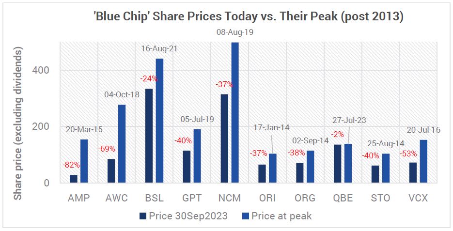 We seriously challenge the notion of ‘permanent blue chips’ in the Australian market, noting that industry structures, regulation and business/consumer preferences change too quickly and too often. While the Australian share market has had overall capital appreciation (ex dividends) of 31.7% since 20131, companies previously identified as blue chips including AMP, Vicinity, Alumina, Bluescope, GPT, Santos, Orica, QBE, Origin Energy and Newcrest all have lower share prices over that same time period (refer Chart 1). There has literally been a lost decade!