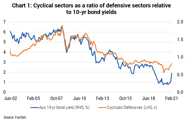 1. Cyclicals had underperformed defensives by 1,079 bps p.a. (283% cumulative) as the Australian 10-year bond yield fell from its peak of 6.78% in Jun-08 to 0.83%[1]. Basically, throwing darts at healthcare or tech stocks would likely have seen strong returns. Since Nov-20, though, this trend has begun to reverse, with cyclicals rising +24% and defensives falling -3% alongside higher bond rates.