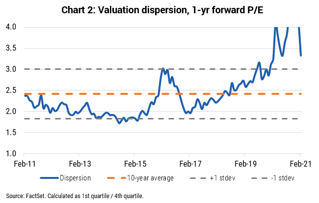 2. Valuations for high-growth companies were literally off the chart, having risen to as high as 51 times 12-month forward earnings, largely due to falling discount rates. They remain elevated at around 40 times – well above the 10-year average of 26 times.