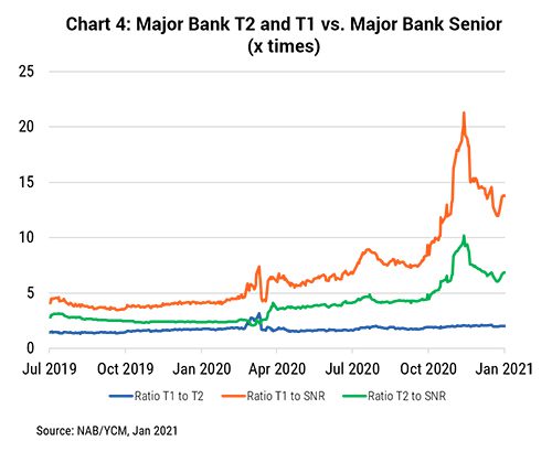 Moreover, as with corporate credit, the expanded multiple to unsecured bank senior is supportive for income sustainability for T2 and T1 securities in 2021 (Chart 4).