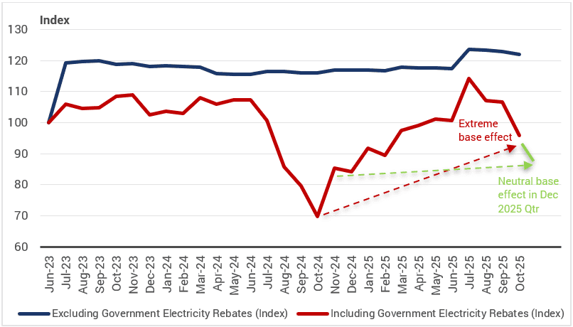 To put this in context, electricity prices inclusive of the subsidies contributed 60ppts to the 3.8% (y/y) inflation print in October. This contribution can be seen via the trajectory of the red line in the chart below. Note that the large impact upon inflation of cycling the October 2024 peak subsidy. Even though some of the renewed payments of subsidies had already started to lower electricity prices sequentially in October 2025, the impact on annual inflation was very significant.