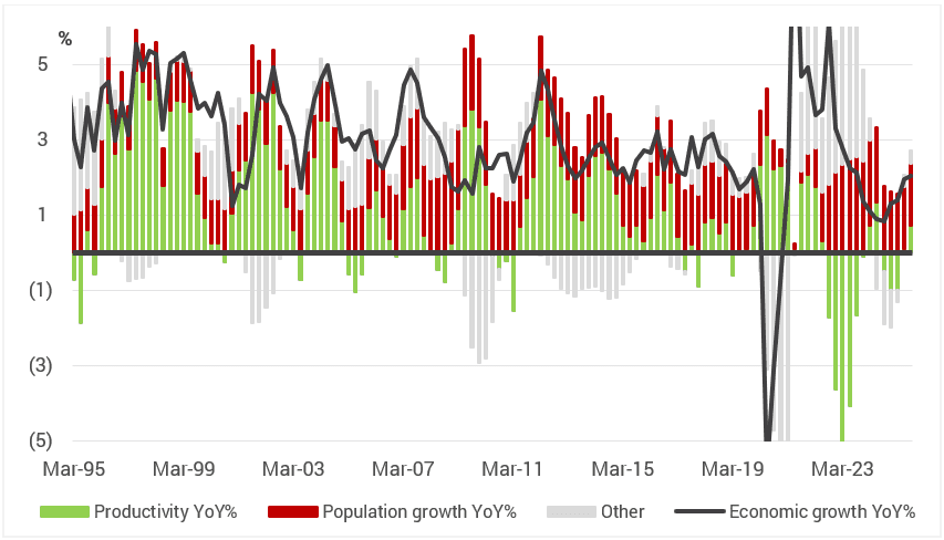On our estimates Australia is operating at -0.5% output gap, the equal largest output gap alongside Canada, compared to the G7 peer group and significantly greater than the USA. More importantly, labour productivity appears to have commenced an upcycle, meaning we expect productivity to trend higher in coming quarters supported by the recovery in private demand and the embracing of AI and related technology.