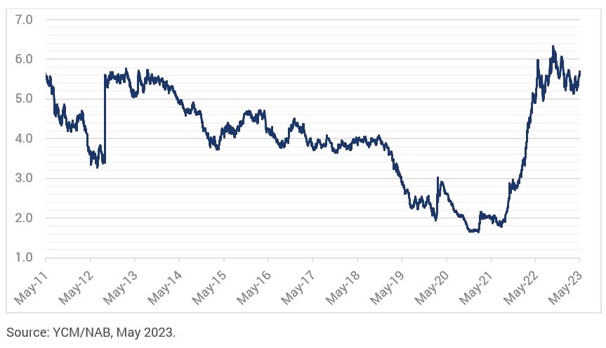 Investors are now generally being well compensated for all aspects of risk, with the most recent Tier 2 deals from Westpac and QBE providing further confirmation. On June 19, Westpac priced BBB+ rated 5-year and 10-year securities at very attractive yields of 6.49% and 6.93% respectively. Similarly, on June 21, the BBB rated QBE 6-year Tier 2s were priced at an attractive credit spread of 310 bps which equated to a yield of ~7.3%. In addition to Tier 2, investment grade RMBS is also offering very attractive risk-adjusted returns with low-risk single A and BBB tranches currently generating floating rate yields of ~8-9%. As for our two major credit funds (Yarra Enhanced Income and Yarra Higher Income), approximate yield to maturities now range at highs of ~7-8% from average investment grade quality, significantly above their 2021 lows (refer Chart 3).