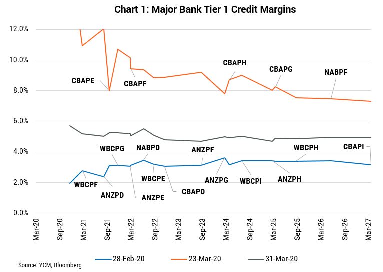 At their month wides T1 securities were trading at levels reminiscent of GFC highs and have since rallied, but are still trading at ~double the credit margins of late February (refer Chart 1).