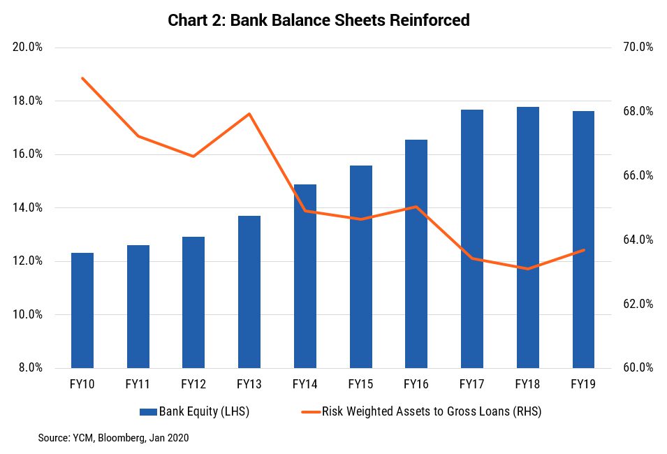 Whereas bank balance sheets were exposed by the GFC in 2008/09, requiring varying levels of direct government assistance, financial regulators have spent much of the last decade strengthening bank balance sheets (refer Chart 2). For credit investors, much higher equity buffers along with a commensurate reduction in risk weighted assets has significantly increased the resilience of bank balance sheets across the debt capital structure.