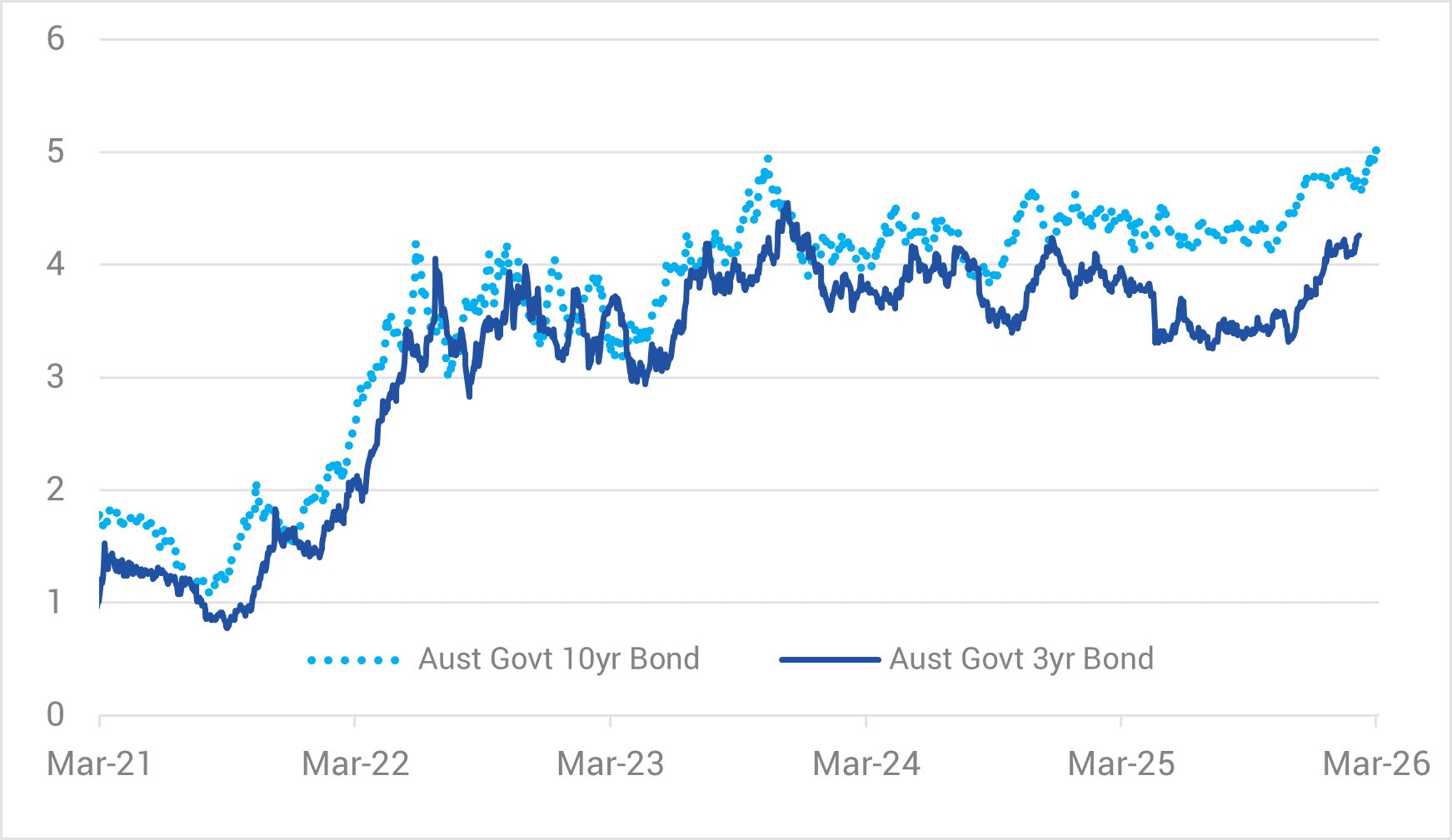 Chart 1: 3-year and 10-year Australian Government Bond Yields (%)