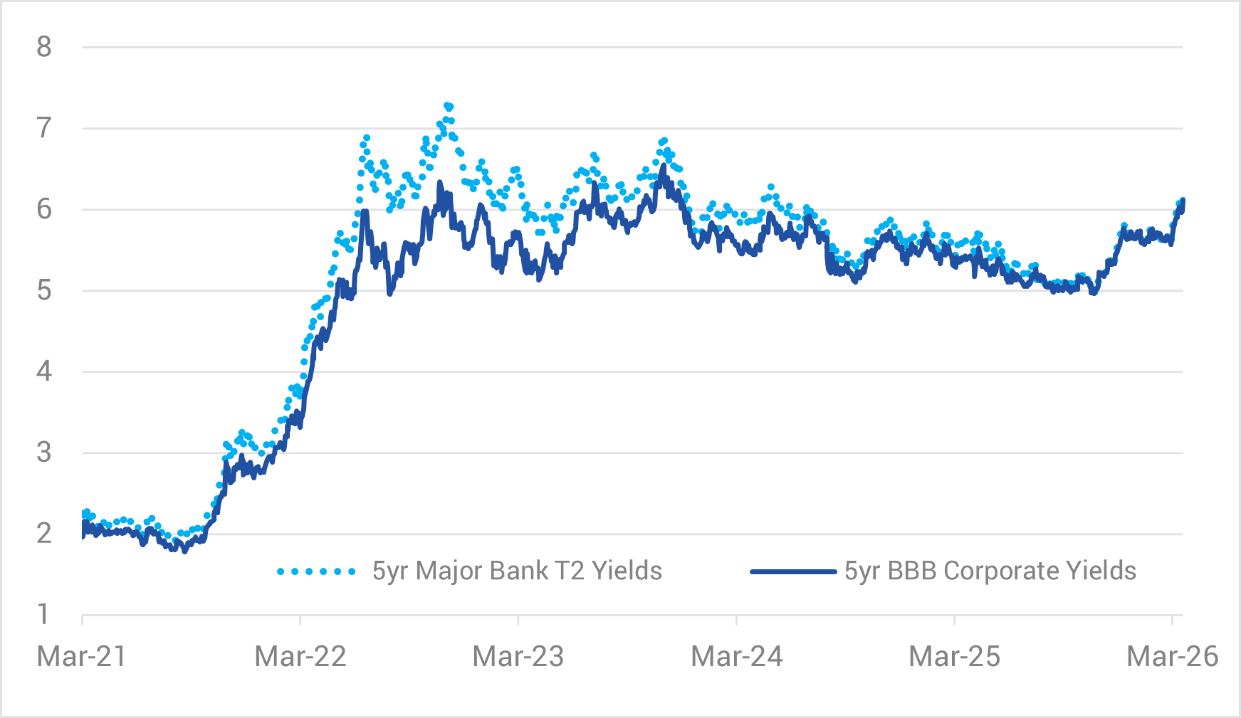 This higher rebasing of interest rates has a commensurate impact on corporate bond yields, with 5-year major bank T2 and triple B corporate yields now both back above 6% for the first time since late 2023 (refer Chart 2).