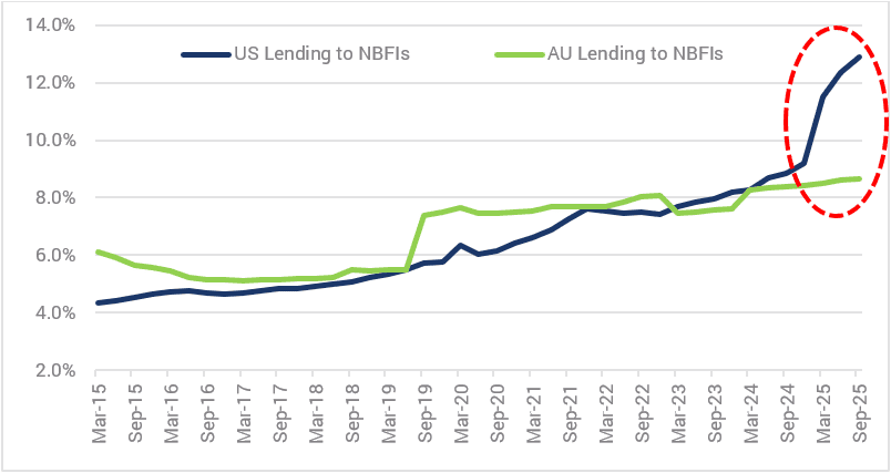 To put this in perspective, US bank loans to NBFIs as a proportion of total commercial loans have increased from ~9% to 13% in the 9 months to September 2025. Similar lending in Australia has remained relatively static, as you can see in the following chart.