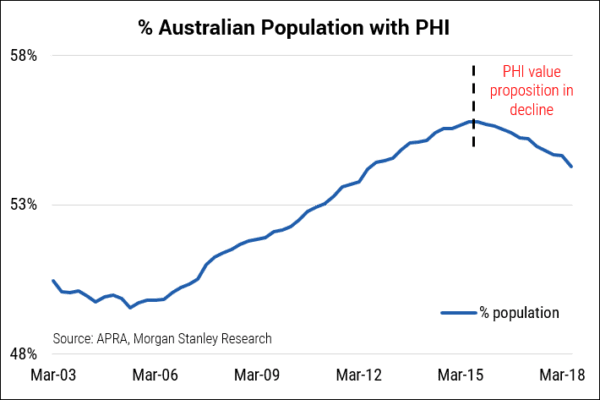 - Patient volumes have declined (Chart 1) due to a more competitive public hospital sector taking market share and falling private health insurance (PHI) participation (Chart 2); and