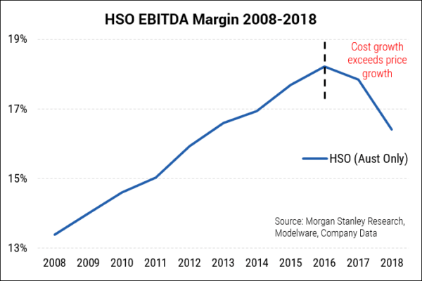 Australia’s private healthcare system faces a raft of challenges. With anaemic wage growth and escalating household utility prices, the value proposition of PHI and thus private hospitals is diminishing. Rising premiums (3-5% p.a.) and out-of-pocket expenses are fast putting the private system beyond reach, and a likely (pro-public hospital) Federal Labor government in 2019 would further constrain private operators.