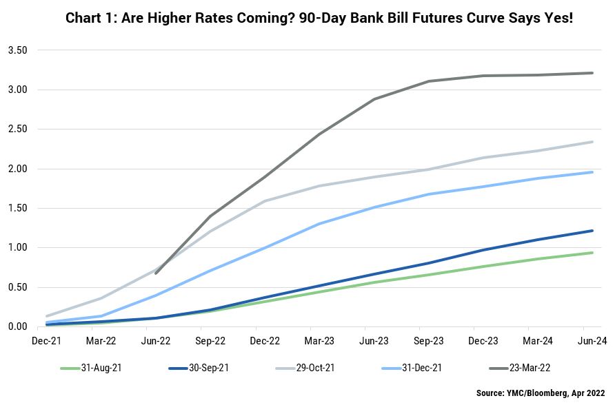 Following a sustained period of higher inflation, complicated more recently by the spike in commodity prices following Russia’s invasion of Ukraine, central banks are increasing interest rates. The Federal Reserve, for instance, has approximately seven rate hikes priced in between now and the end of 2022, with a similar amount also priced into Australian rate markets as indicated by shifts in the 90-day bank bill futures curve since August 2021 (refer Chart 1).