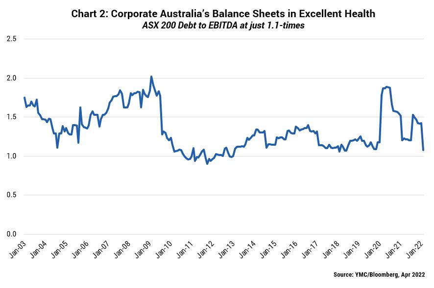 Some slowing of economic growth now looks inevitable, but Australian credit remains very well placed, benefitting from high household savings and fiscal support which has been enhanced by past stimulus and soaring commodity prices. Moreover, corporate Australia is in a strong position to maintain its credit quality, with balance sheets currently their strongest since 2010/11 (refer Chart 2).