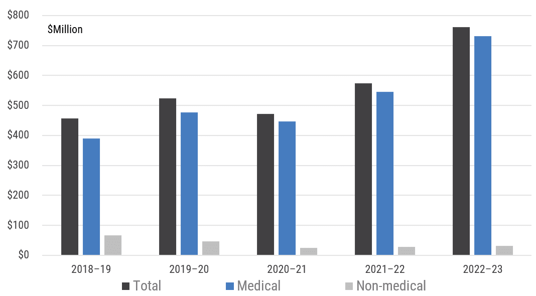 However, this is not the case. The weight loss subcategory for ERS provided total grants of $249 million in 2022-23 – one third of total funds provided under the compassionate early release scheme. However, its share pre-COVID was 45% of total funds in 2019. Moreover, the average payment of $17.3k per approved applicant has barely changed.