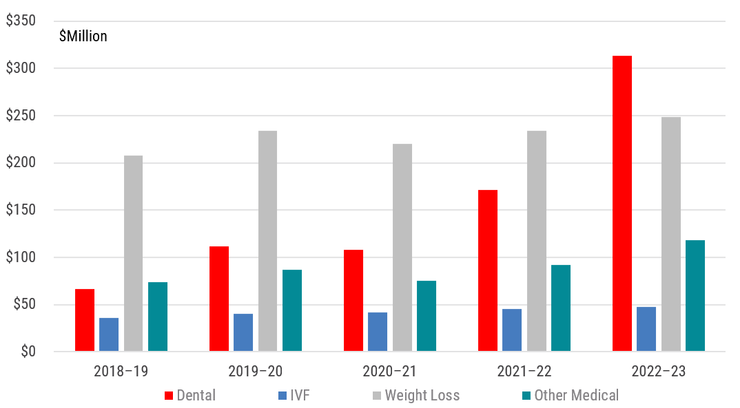 Clearly most of the action over the past five years has been happening under the dental category (refer Chart 2). The funds granted for dental have boomed, up from $66 million in 2019 to $313 million by 2023 – a 373% increase! The average payment per approved dental applicant also rose a sizeable 21% from $19.1k to $23.2k over the same period. At the current rate of growth, withdrawals from super under the dental category will exceed $1.2 billion by 2027.