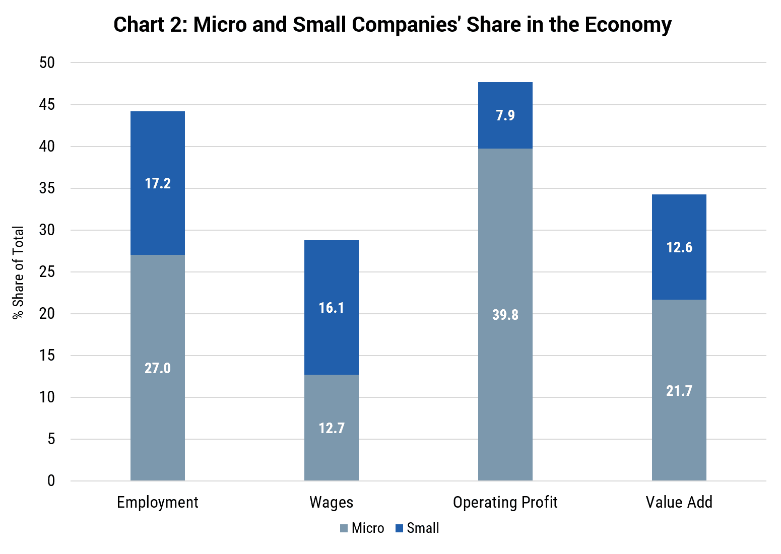 Another way to show the disparity is through company size: organisations with fewer than 20 employees make up 44% of the workforce, contribute 48% of profits and represent 34% of economic output.