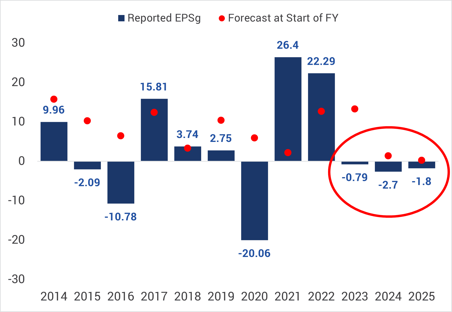 Chart 1: Australian Companies – Reported EPSg vs Initial Forecast (%YoY)