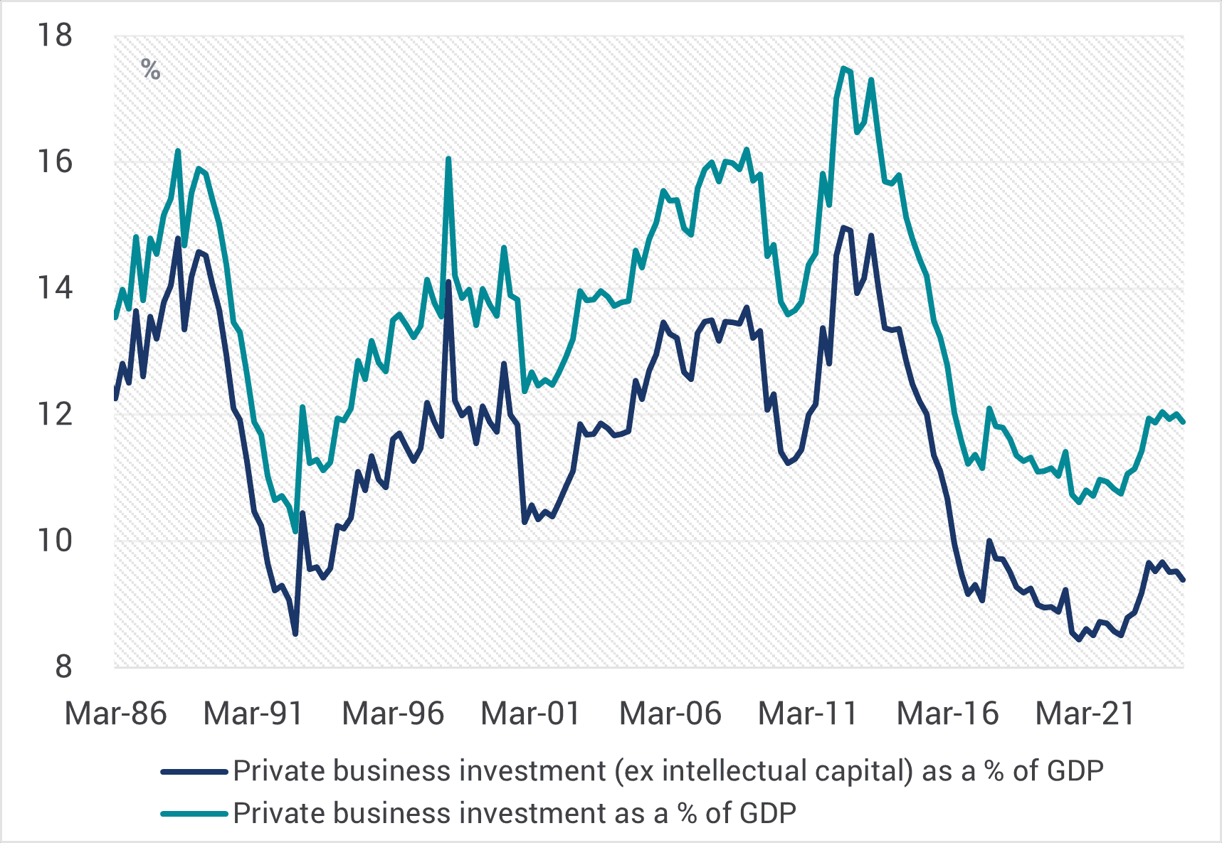 Chart 2: Private business investment share of GDP is down 30-40% since 2012