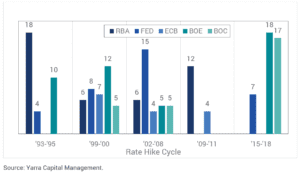 Global central banks have raised interest rates between 400-500 basis points over the past two years to combat rapid rising inflation, post-quantitative easing. With inflation coming off multi-decade highs and seemingly on track to reach central bank targets, most have paused interest rate hikes, and the market view is that global bond yields have most likely peaked. The exact timing or magnitude of any rate cut will be dependent on the economic conditions at the time, however past cycles confirm that rate cuts in 2024 are possible (refer Chart 1).