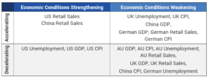 Below we examine some key economic indicators in a few relevant economies and map out whether the latest data releases are strengthening or weakening, and whether the trend is accelerating or decelerating.