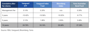 While Index funds may appear cost effective at first glance, over the long term their impact on returns relative to the benchmark, particularly compared to active bond managers, is often considerably lower after accounting for fees (refer Table 1).