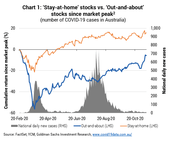 As the chart below indicates, “Stay-at-home” stocks have outperformed “Out-and-about” stocks by 21% since the market peak back in February. The former (which comprises a basket of companies including Afterpay, NEXTDC and Woolworths) have risen 16%. Conversely, the latter (with companies like Qantas, Scentre Group and Transurban) have fallen 6%.